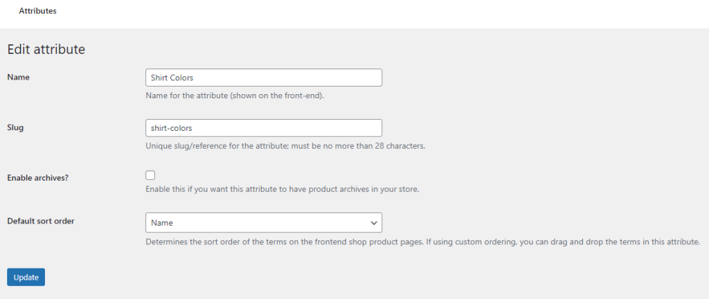 Enter a name for your attribute (e.g., “Shirt Colors”) and, optionally, a slug for URL optimization.